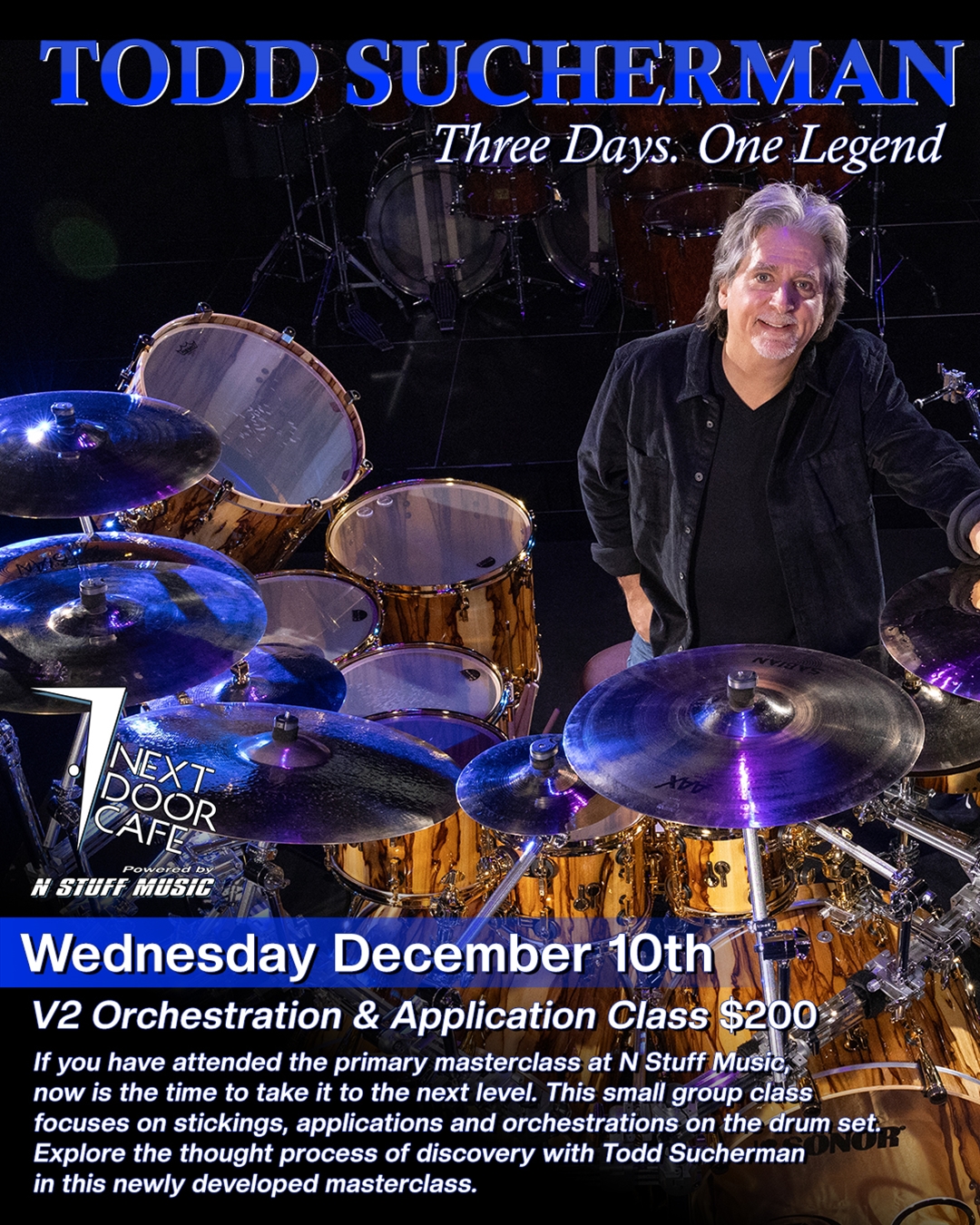 If you have attended the primary masterclass at N Stuff Music, now is the time to take it to the next level. This small group class focuses on stickings, applications and orchestrations on the drum set. Explore the thought process of discovery with Todd Sucherman in this newly developed masterclass.